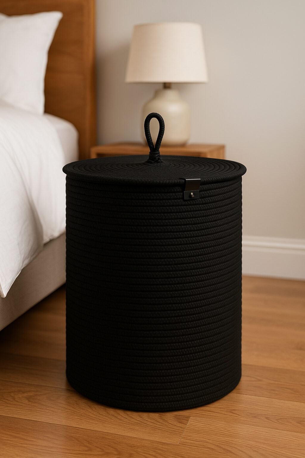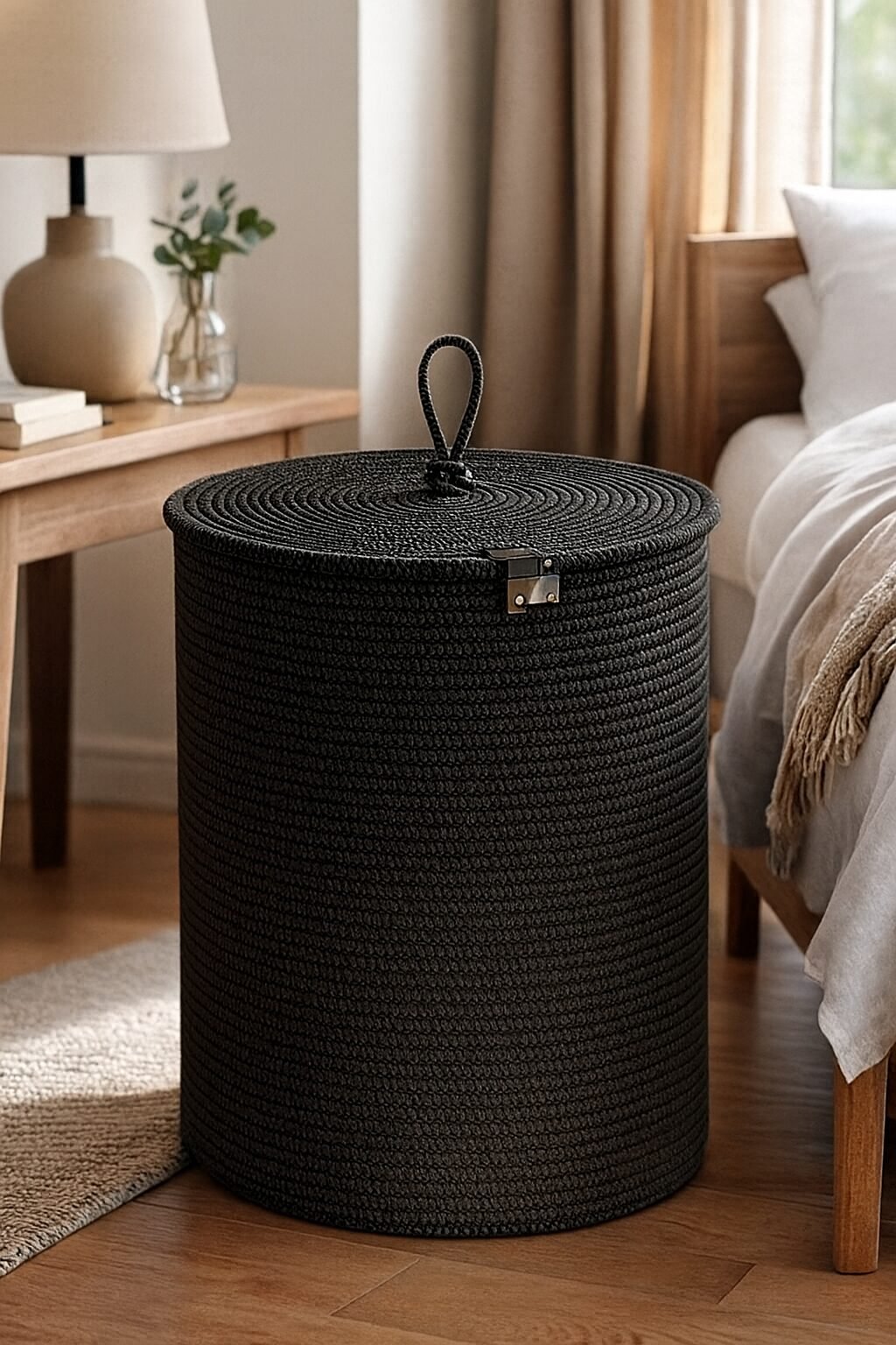 Upgrade your home storage with this sleek Black Cotton Rope Laundry Basket with Lid, crafted for both function and elegance. Designed in a modern cylindrical shape with a tight spiral weave, this handmade basket is perfect for organizing laundry, blankets, toys, or towels—while adding a refined, minimal touch to your bedroom, nursery, or bathroom.